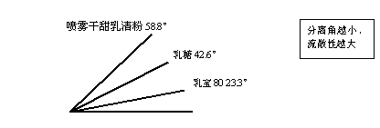 結(jié)果:與噴霧干甜乳清粉和乳糖相比,乳寶80具有更好的流散性。乳寶80的平均分離角是23.3°,噴霧干甜乳清粉和乳糖分別需要58.8°和42.6°角才可以滑落。