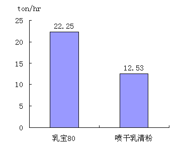 結(jié)果:乳寶80的裝卸速度是22.25噸/小時(shí),噴霧干甜乳清粉是12.53噸/小時(shí)。試驗(yàn)在美國某飼料公司進(jìn)行,該廠裝卸玉米的速度為30噸/小時(shí)。