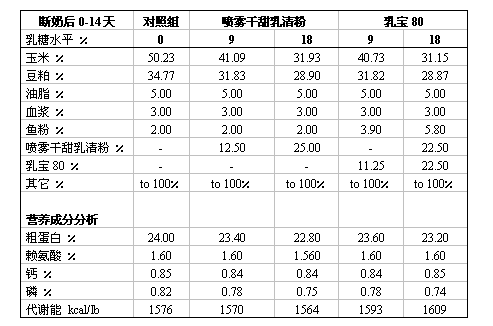 試驗(yàn)?zāi)康模?/strong>斷奶后前2周,用乳寶80替代噴霧干甜乳清粉飼喂仔豬的效果。