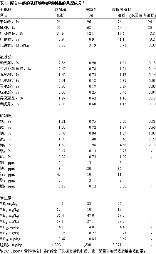 典型的乳清粉含有68%的乳糖和12%的蛋白質(zhì)(表1)(NRC,1998)。乳清中主要的蛋白質(zhì)是β-乳球蛋白(56~60%)、α-乳白蛋白(18~24%)、牛血清白蛋白(6~12%)和免疫球蛋白(6~12%)(Harper,2000)。這些特殊的蛋白質(zhì)不僅可作為氨基酸源,還可作為一種抵抗微生物感染的防御物質(zhì),并且是生長因子和調(diào)節(jié)劑的來源(Harper,2000)。乳清中發(fā)現(xiàn)的WPC蛋白質(zhì)濃度雖然都較低,但有著重要的生物學特性,這些蛋白質(zhì)包括乳鐵傳遞蛋白、乳過氧化物酶、溶菌酶、酪蛋白糖巨肽、磷酸肽和脂肪球膜蛋白質(zhì)(Harper,2000)。