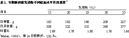在俄亥俄州立大學、堪薩斯州立大學和密蘇里大學的研究也證實了早期斷奶仔豬日糧中相對高水平乳清粉的效果。Mahan(1992)研究表明,乳清粉添加水平高至35%時對仔豬都有效果(表3)。在WPC一些研究(Graham等,1981;Tokach等,1989;Nessmith等,1997)中也有同樣的報道。雖然有研究指出乳清的一些有益特性在于它所含的蛋白質(zhì)(Tokach等,1989),但是大部分的研究表明,乳清的有益特性主要歸功于它所含的乳糖(Baird等,1974;Mahan,1992)。