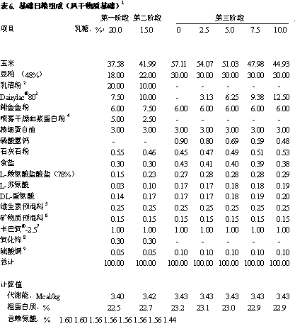 kg。在試驗期的第1和第2階段不同試驗地點的豬飼喂相同日糧(表6)。這兩種日糧的乳糖添加水平的計算值分別是20.0%和15.0%,總賴氨酸是16.0%。